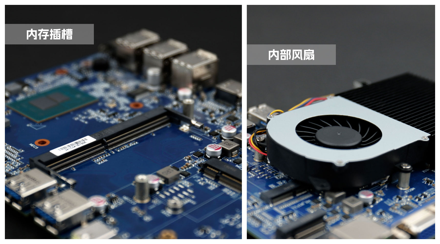 long8-龙8桌面云终端Y-BOX S2主板中部是内存插槽,采用单通道笔记本内存槽设计,最大支持容量可达32GB,最高支持DDR4-3200MHz频率,横插的形式可以减少主板的占用体积,使整体机身更紧凑,内存顶部的风扇起到高效散热的作用。
