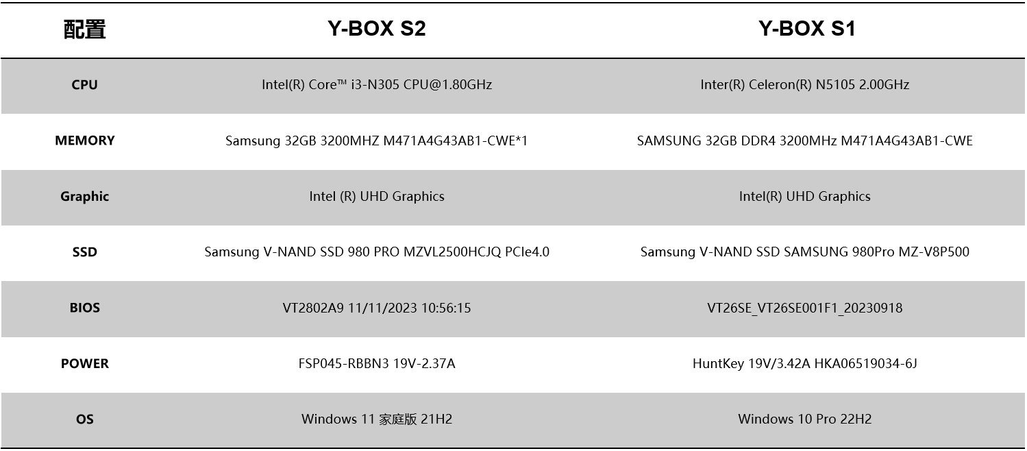 针对桌面云终端Y-BOX S2的测试项目中,最值得关注的是性能测试的跑分数据和稳定性测试内容,这能直观影响主机在使用过程中的稳定性和用户的使用体验。针对性能测试,我们选择了将Y-BOX S2与前一款更迭产品Y-BOX S1进行对比分析,Y-BOX S2支持Intel® Alder lake-N处理器,Y-BOX S1支持Intel® Jasper Lake,并分别选取了以下配置:
