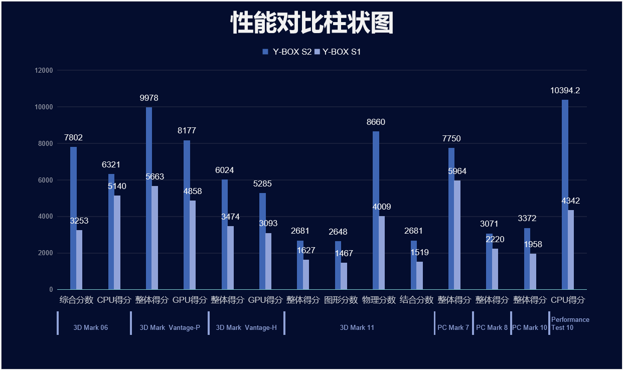 我们来具体看看各个测试项目的跑分情况,测试项目包括显示性能测试、系统性能测试、CPU性能测试,分别用3D Mark、PC Mark以及Performance 10等系列不同软件的跑分数据,针对两款主板的跑分情况可以看出,long8-龙8桌面云终端Y-BOX S2的数据在各项性能上都得到了大幅度提升,柱状图能更直观地体现出数据的变化,我们将针对具体的几项数据来进行详细分析。