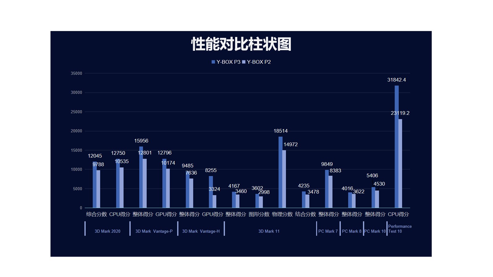 我们来具体看看各个测试项目的跑分情况,我们分别用3D Mark、PC Mark以及Performance 10等不同系列不同软件进行跑分,测试项目涵盖显示性能测试、系统性能测试、CPU性能测试等。通过下面的表格及柱状图可以看出,long8-龙8桌面云终端Y-BOX P3的数据在各项性能上都得到了大幅度提升。
