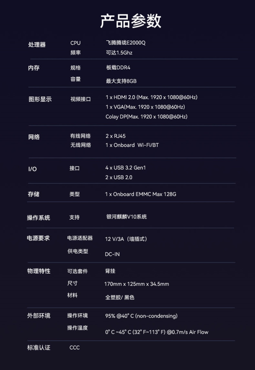 云终端VT32搭载了飞腾腾珑E2000Q处理器和其他国产组件,E2000Q集成2个FTC664和2个FTC310处理器核,主频达1.5GHz。