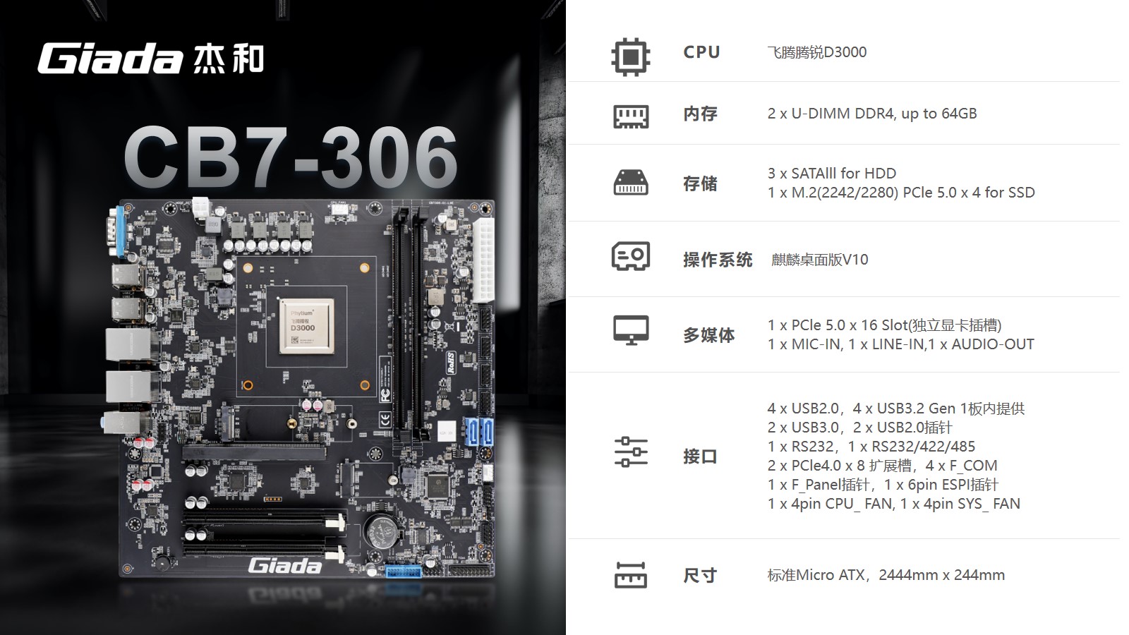 搭载飞腾腾锐D3000处理器,腾锐D3000是目前国内性能最强的 ARM 架构桌面 CPU。它的主频达到2.5GHz,集成了 8 个飞腾自主研发的新一代 FTC862 高性能处理器内核。支持双通道DDR4内存,支持16条PCIe 5.0总线,可外接独立显卡。主板尺寸为标准Micro ATX,244 x 244 mm大小,搭配系统为麒麟桌面版V10。