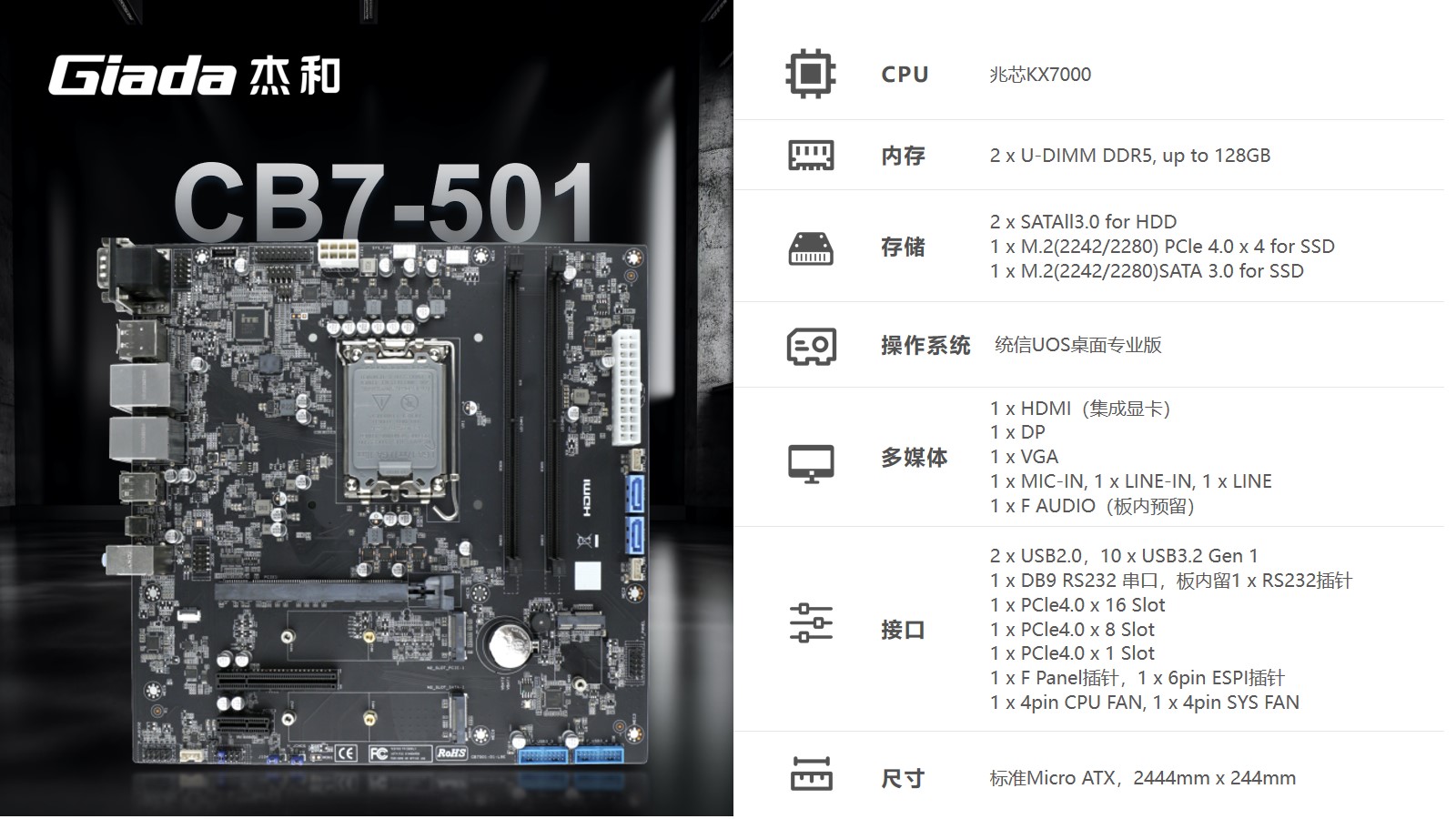 搭载兆芯开先KX-7000国产处理器,基于X86架构、8核8线程,主频达3.7GHz。支持主流双通道DDR5内存、配备了PCIe 4.0 x16 、 PCIe 4.0 x8 、PCIe 4.0 x1 插槽,满足多种扩展卡安装需求。尺寸为标准Micro ATX,244 x 244 mm大小,搭配系统为统信UOS桌面版。