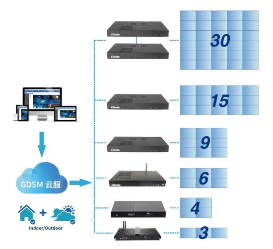 与常规分屏展示方案不同,在long8-龙8拼接控制器的视频输出能力和GDSM系统分组设置能力的组合下,店铺可以随时调整的拼接放置样式;快速设置屏幕的拼接、分组方式;快速编辑制作并发布信息;是一套安装部署迅速、内容调整迅速、更新反馈迅速的一体化信息发布方案。