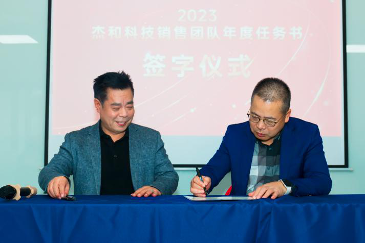 签约仪式中,国际营销中心业务代表刘正文和国内营销中心业务代表李喆发言,两位代表朴实的发言表示,销售人员必须要努力和坚持,要有愚公移山的精神才能成就了2022年的可喜成绩,同时完成2023年度目标必须怀着奋斗者的精神去努力拼搏,2023年我们业务会冲到前线,紧贴市场,紧贴客户,抢夺订单。