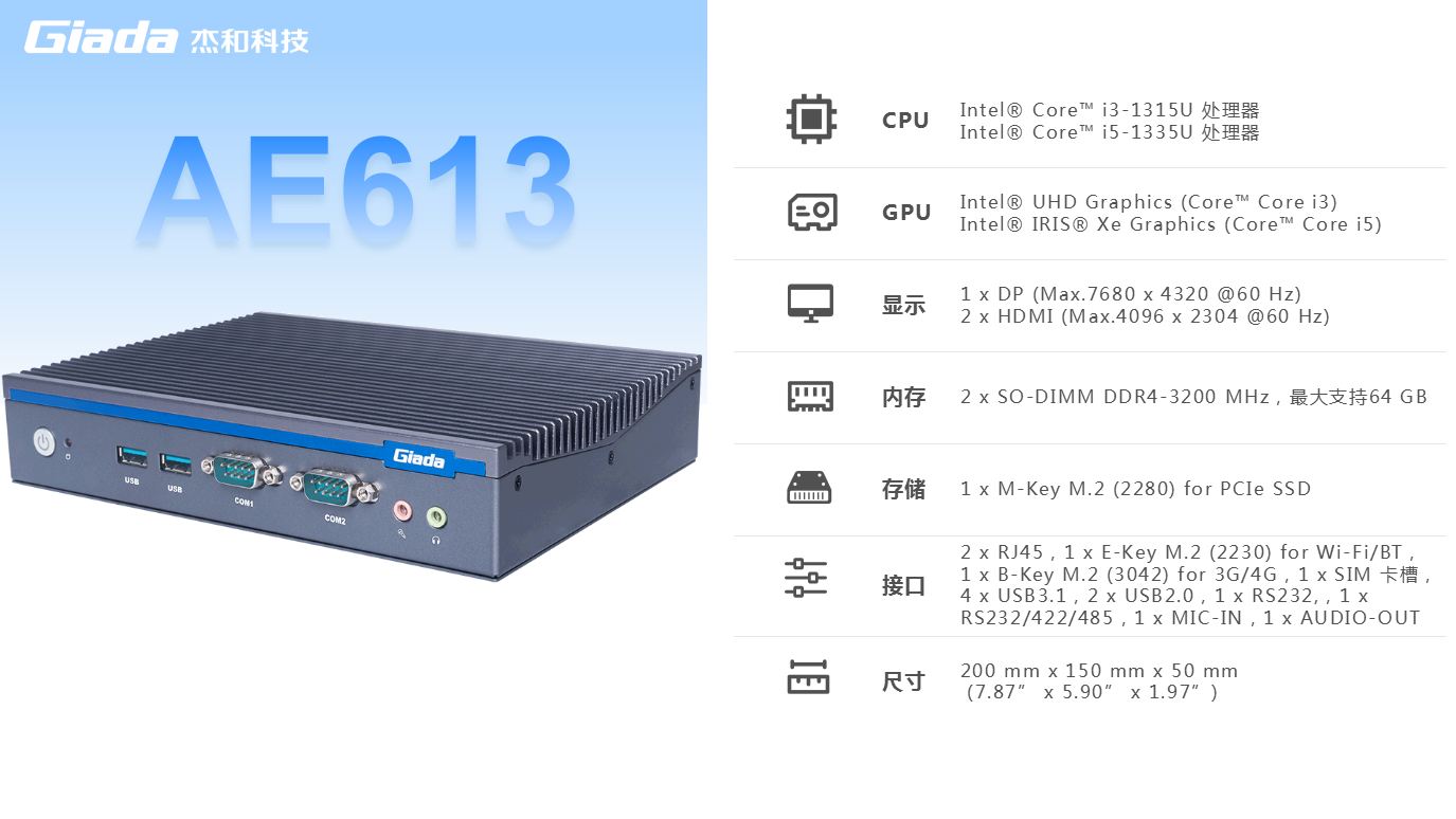 long8-龙8科技AE613支持Intel®第13代Core i3/i5处理器,Intel®第13代Raptor Lake处理器使用更加精进的Intel 7制程工艺,引入的强大性能混合架构,拥有更高的频率设计、双倍能效核以及更大的L2 缓存,带给使用者更好的处理器性能提升。TDP为15W,在最大限度地降低能耗的同时提供卓越的处理能力。AE613支持2 x SO-DIMM DDR4-3200 MHz内存、1 x M-Key M.2 (2280) for PCIe SSD存储,强大的配置能够为用户带来出色的计算和处理性能。