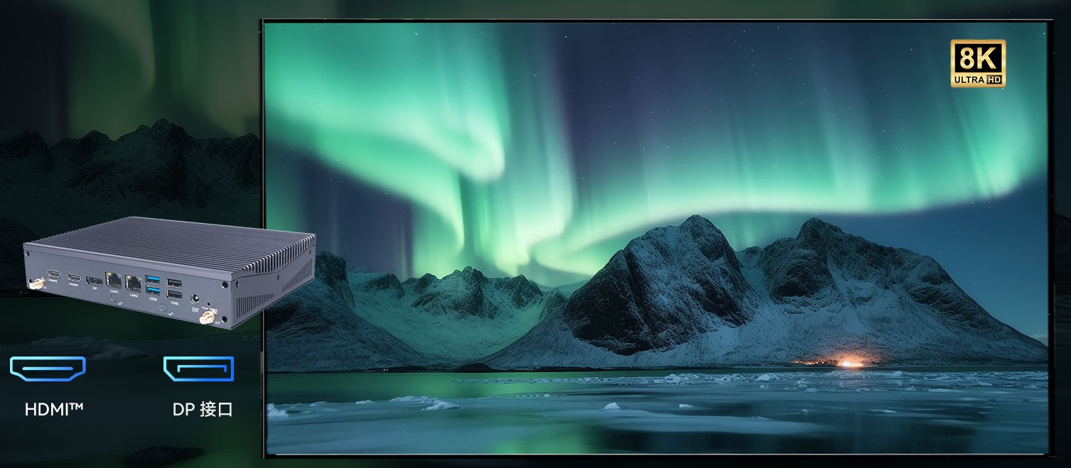 long8-龙8科技AE613集成Intel®UHD Graphics (Core i3)/Intel®Iris®Xe Graphics (Core i5) GPU,支持1 x DP (Max.7680 x 4320 @60 Hz),2 x HDMI (Max.4096 x 2304 @60 Hz),支持8K分辨率(7680 x 4320 @60 Hz),支持3个独立显示器,可实现拓展、复制、独显模式,出色的图形处理能力,提供令人惊叹的视觉效果和沉浸式画面体验。