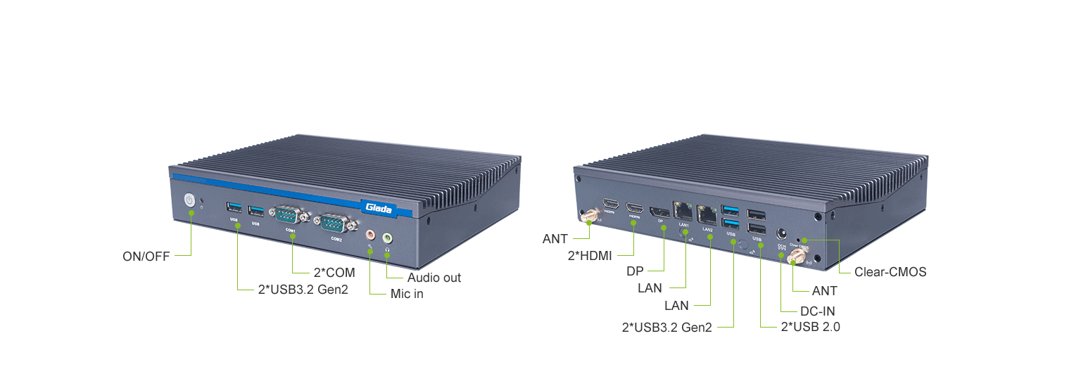 long8-龙8科技AE613支持Windows 11 (64bit) /Linux Ubuntu (64bit)系统,双千兆自适应RJ45网口,4 x USB3.1 (10 Gbps),2 x USB2.0,1 x RS232,,1 x RS232/422/485,1 x MIC-IN,1 x AUDIO-OUT,丰富的I/O功能接口,实现更多功能扩展。