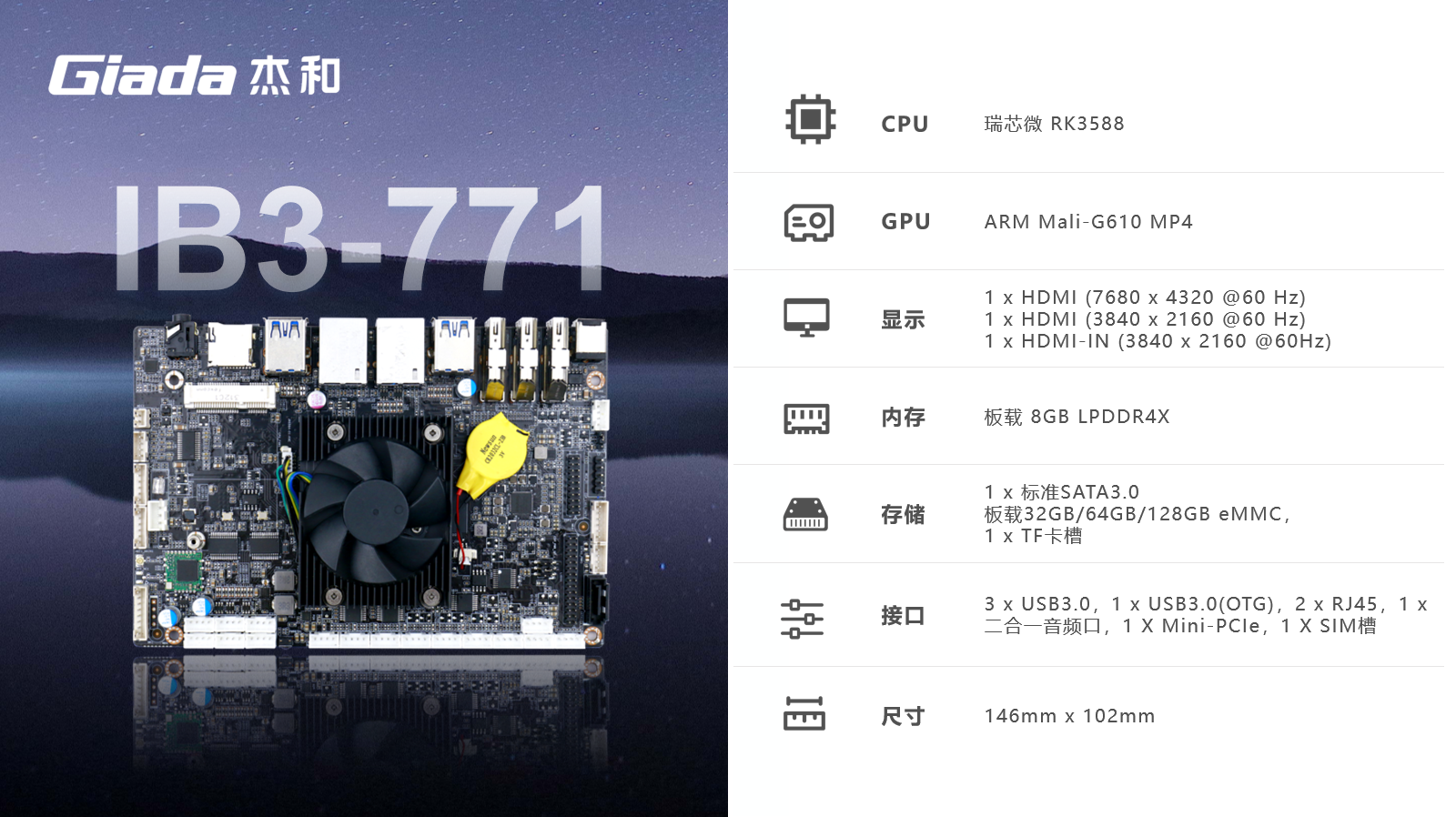 long8-龙8ARM主板IB3-771采用瑞芯微RK3588处理器,满足各种人工智能场域对嵌入式主板包括但不限于高算力、低功耗、高扩展性、高可靠性、高安全性等要求,支持在宽温、复杂电磁等恶劣环境下稳定运行,可广泛应用于机器人、边缘计算、智能NVR、智能汽车、智慧大屏、AR/VR、ARM PC、智能自助终端等AIoT行业类应用市场。