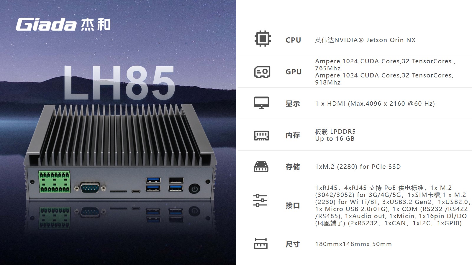 long8-龙8科技AI边缘计算LH85,拥有100TOPS超强算力,能为工业控制领域客户的AI应用提供强大的算力支持和充足的通信、控制接口保障,可广泛应用于智能制造、机器视觉、AGV、智慧城市等领域。