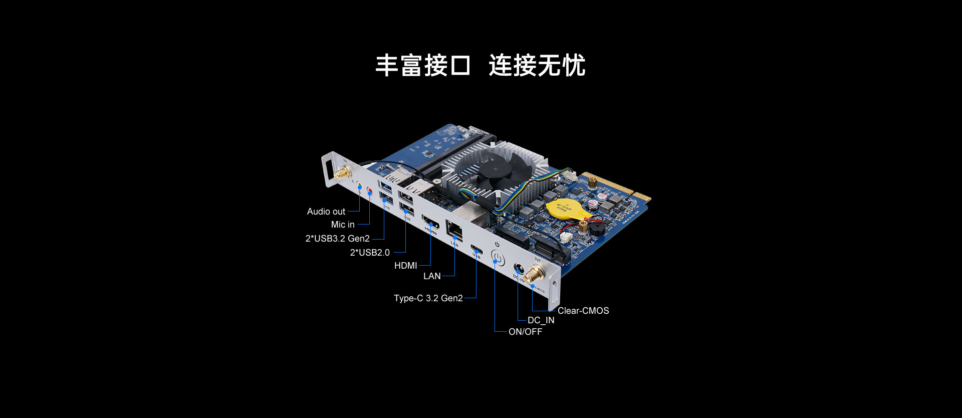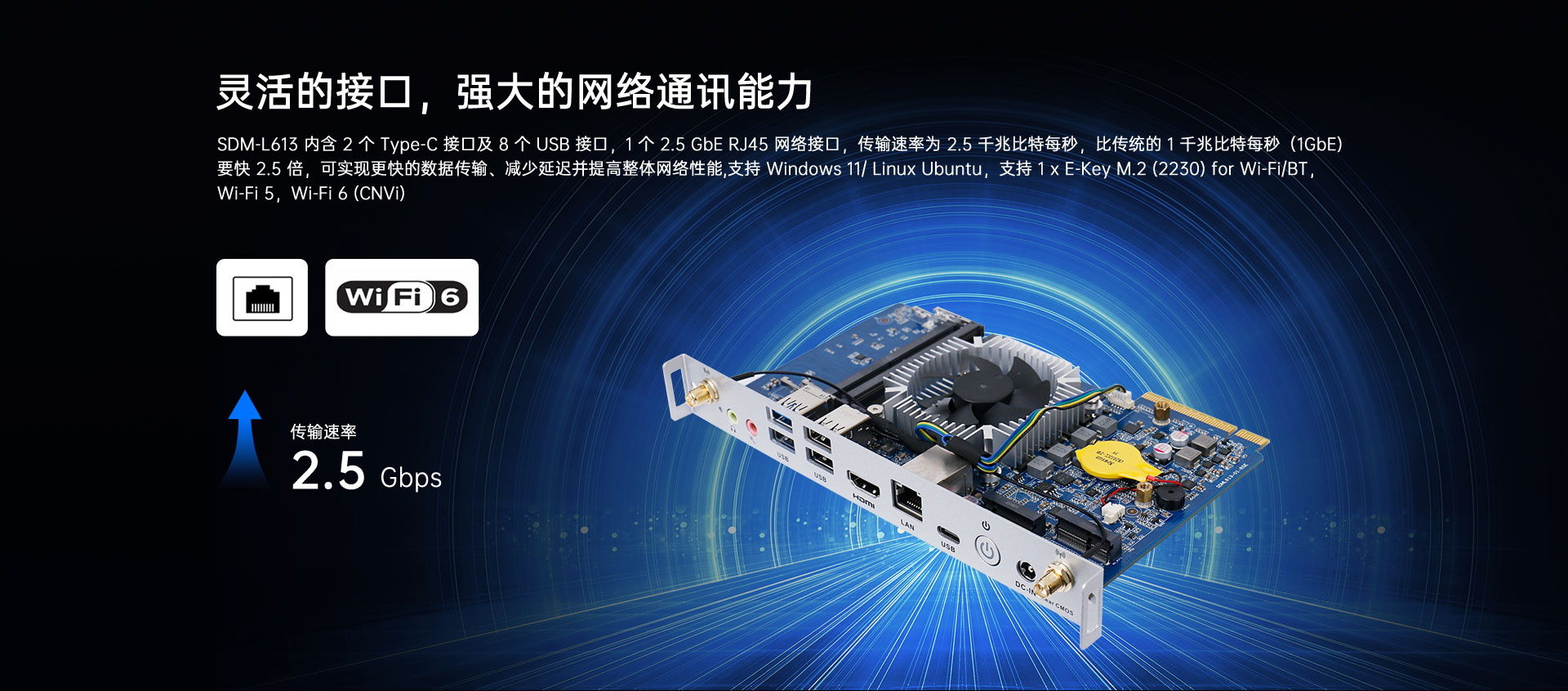 1 x 2.5GbE RJ45,1 x E-Key M.2 (2230) for Wi-Fi/BT,Wi-Fi 5,Wi-Fi 6 (CNVi)
