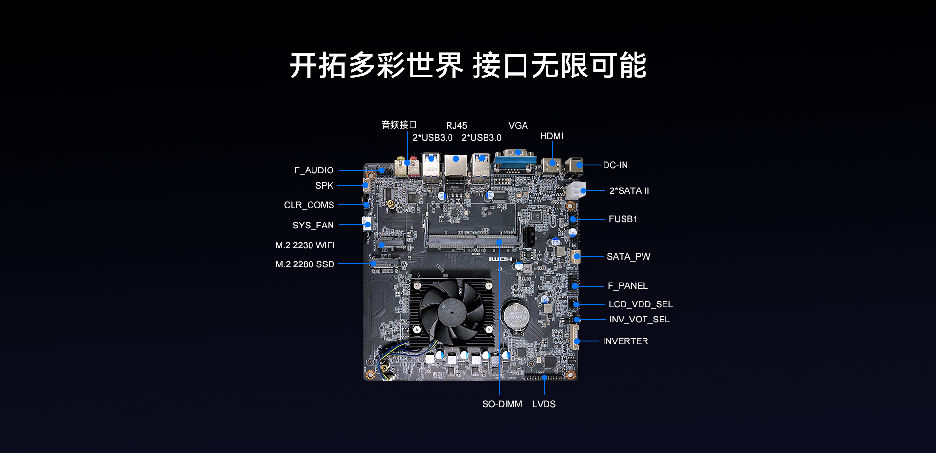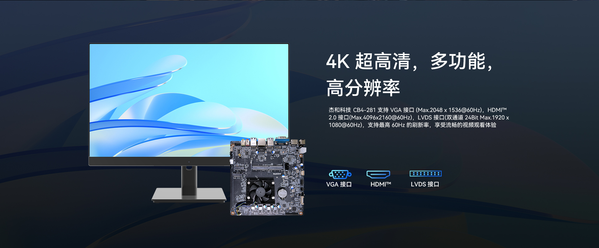 提供1x LVDS +1x HDMI™2.0+1x VGA 三视频接口输出